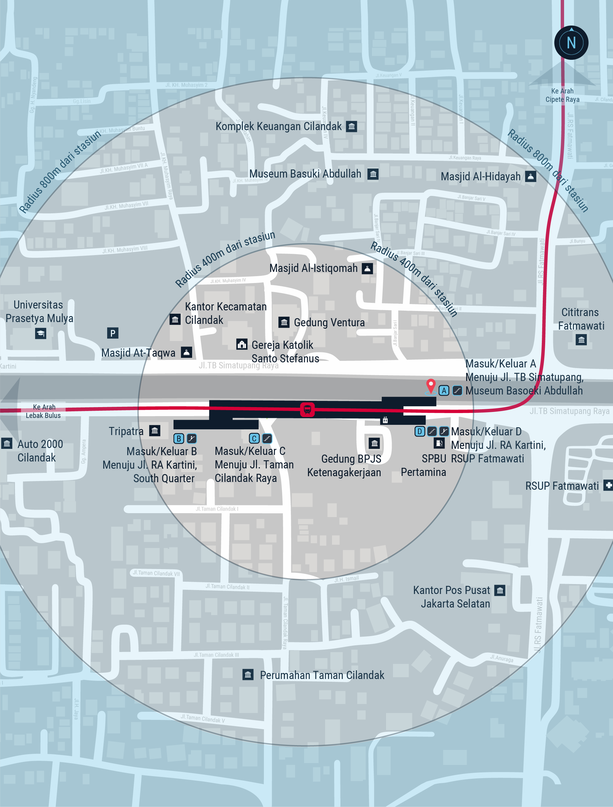Stasiun layang kedua di area komersial yang sibuk di Jakarta Selatan. Stasiun ini bernuansa menyejukkan, sehingga dimunculkan dominasi warna biru dan gradasinya.